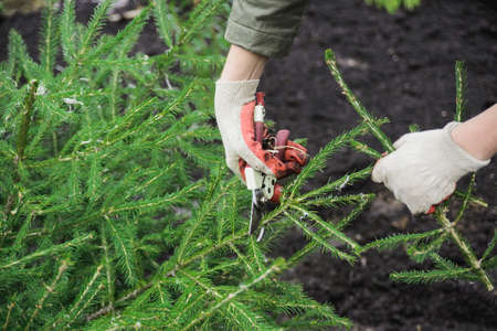 woman hand in gloves with scissors cutting old fir tree branch, landscape designer autumn preparing for winter on garden plot, horizontal stock photo image