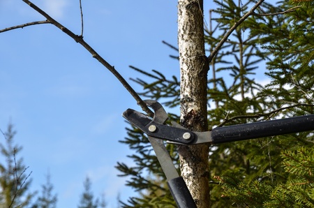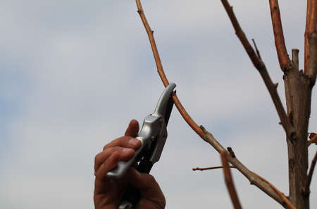 Spring pruning of trees with pruning shears. In the garden of a country house.