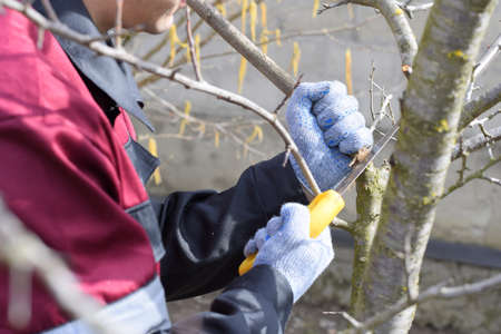 Pruning a tree with a hand saw, gardener works in the garden with fruit trees, spring work in the garden.