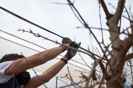 Closeup on the hand of a worker cutting branches in an orchard using garden shears. A beautiful spring day is great for working in an orchard.