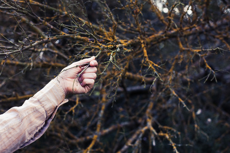 woman hands pruning dry branch with hand pruners in evergreen garden
