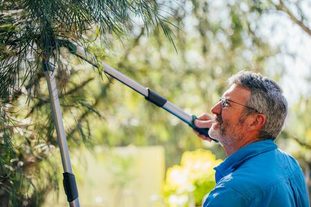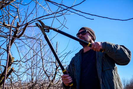 Farmer is pruning branches of fruit trees in orchard using long loppers at early springtime.