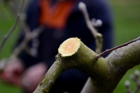 Closeup of gardener's hands pruning fruit tree branches with pruners