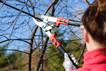 Home gardening concept. Young woman cutting twig of fruit tree in the garden on a sunny day