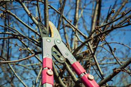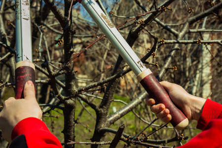Pruning the branches of a fruit tree with pruning shears and garden shears. A tool in the hands of a man. Sawing wood, caring for wood. Gardening. Preparing the garden for the summer season.