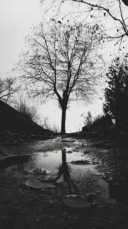 Bare tree reflects in a puddle