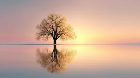 AI Generated. Solitary Tree Reflected in Calm Water at Sunrise