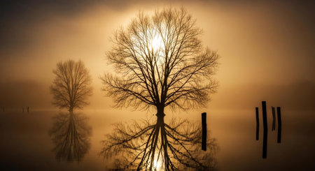 A stunning scene capturing a solitary tree standing by a calm lake, its reflection beautifully mirrored in the water beneath a gentle morning fog, evoking serenity and stillness.