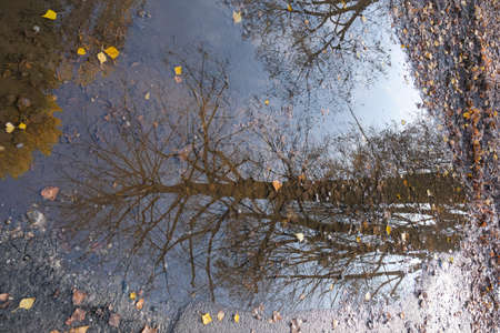 tree reflected in autumnal puddle. High quality photo