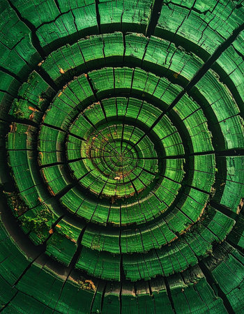 A mesmerizing top-down view into the core of an ancient log, where vibrant green hues highlight the deep cracks and concentric rings. This abstract image creates a hypnotic spiral, suggesting a journey through time, natures complexity, and the mysterious cycles of life.