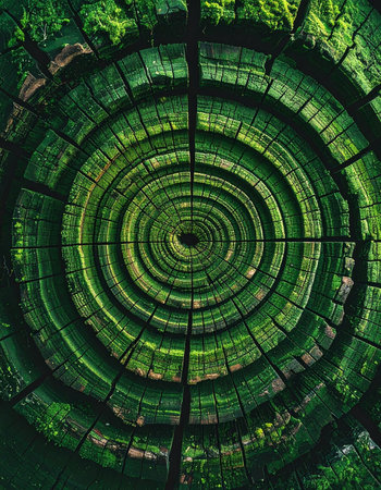 A mesmerizing top-down view into the core of an ancient tree stump, where vibrant green moss highlights the intricate patterns of its growth rings. Each concentric circle tells a story of time, resilience, and the cyclical nature of life and decay in the forest, creating a hypnotic and organic abstract background.