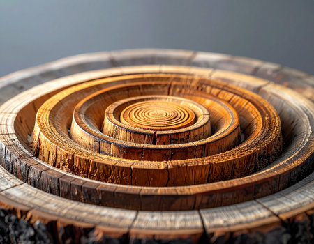 A mesmerizing close-up of a tree log, where the annual growth rings have been meticulously carved into a continuous, concentric spiral. This abstract representation visualizes the passage of time, the cycles of nature, and the beauty of organic patterns, creating a powerful symbol of growth and history.