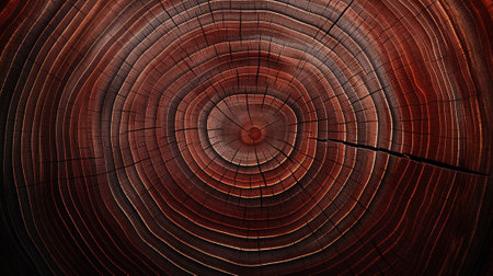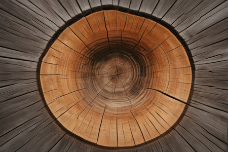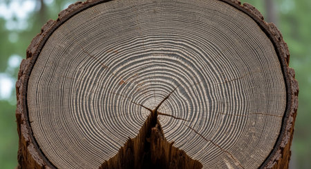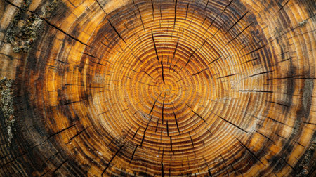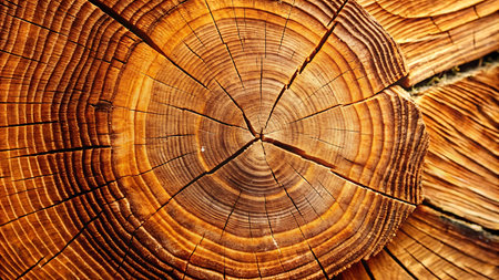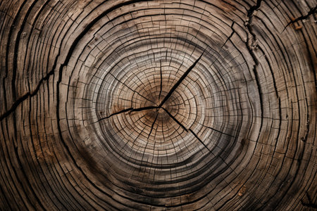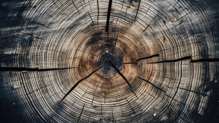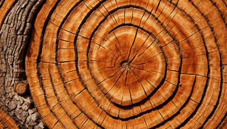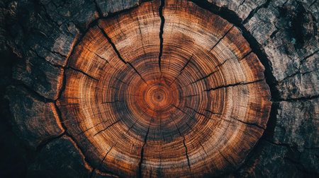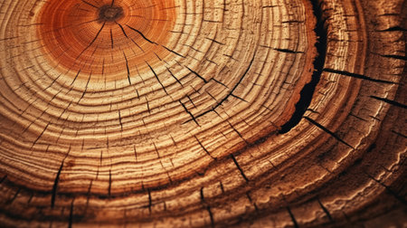 This image captures a detailed close-up of tree rings, displaying the intricate cracks, circular growth layers, and organic wood texture of a cut log, revealing its natural history. AI generated image