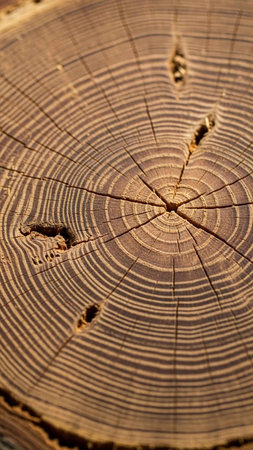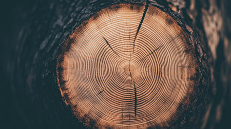 A detailed view reveals the aged texture of timber, highlighting concentric growth layers and natural fissures that tell a story of time and resilience.