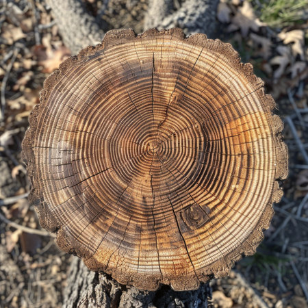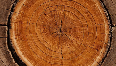 This image showcases the cross-section of a tree stump, revealing intricate annual growth rings and radial cracks. The texture features shades of brown and tan, highlighting the wood's natural patterns. The composition provides an overhead view, potentially suitable for design, educational, or environmental themes.