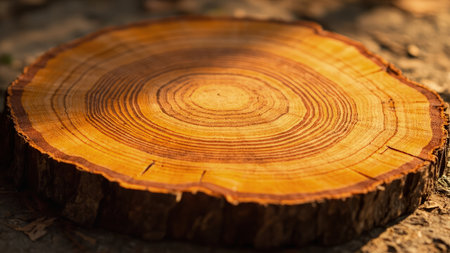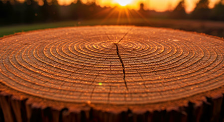 Close-Up of Distinct Tree Rings on a Freshly Cut Wooden Stump Bathed in Golden Sunset Light