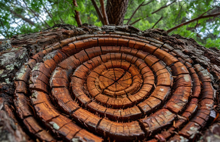 A detailed view of a tree stump reveals the intricate spiral pattern of annual rings, showing the natural beauty and history of this terrestrial plants wood material