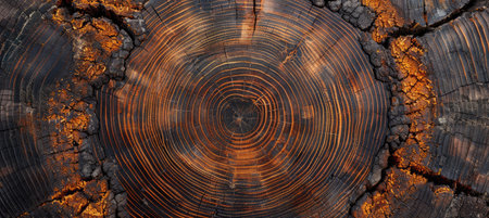 Detailed cross-section of an old tree trunk, showing rings and texture, creating a natural wooden banner template.