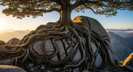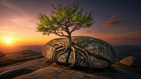 A tree with visible roots grows on a large rock, set against an orange and purple sunset. The image displays a natural landscape with soft lighting, highlighting textures. This visual is suitable for illustrative purposes, editorial content, and various design applications.