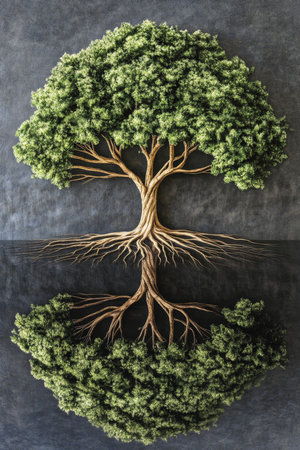 A powerful illustration of a solitary tree, its lush green canopy balanced by an intricate and deep root system revealed against a clean white background.