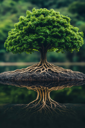 A tree with sprawling roots reaching into the water, creating a serene, natural scene reflecting harmony between land and water.