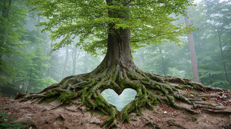 A tree with roots shaped like a heart stands in a forest filled with green foliage and soft light.