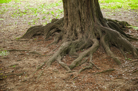 The spreading root system of the old tree on the ground. The variety of shapes in wild nature. Perfect background for the various kinds of collages, illustrations and digital media.
