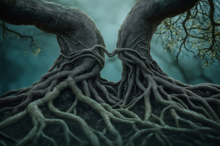 Intertwined roots and branches of two trees symbolize connection, unity, and strength, creating a captivating visual representation of symbiotic relationships