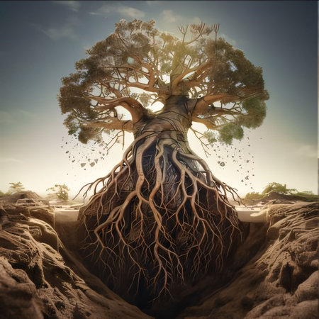A close-up of a 3D tree's roots penetrating dry soil, emphasizing the connection between healthy ecosystems and drought resilience, perfect for World Environment Day 2024