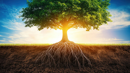 A beautiful tree stands strong against a bright backdrop, its robust roots visible beneath, representing growth, resilience, and the peaceful connection between nature and earth.
