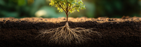 A tree with deep roots in the soil, symbolizing a strong foundation and the concept of growth on a sunny day background. The concept of nature, environmental protection, life, or World Environment Day. --ar 128:71 --v 6.1 Job ID: 2e99bf29-dd8c-40c5-95de-73d2bf99b3d5