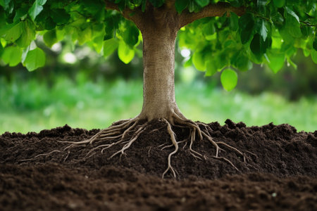 Tree with visible roots underground depicting growth, foundation, strength, and connection to nature, ideal for sustainability and life metaphor concepts.