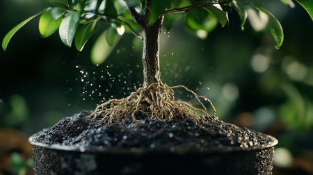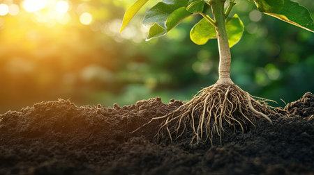 A young plant emerges from rich soil, showcasing its roots as sunlight filters through the leaves. This image captures the essence of growth and nurturing in nature.