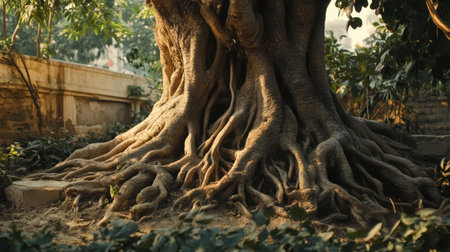 Discover the enchanting beauty of a majestic old tree with intricate roots, bathed in warm sunlight amidst lush greenery, evoking calm and tranquility.