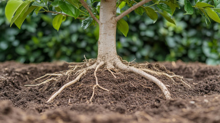 A picturesque tree stands tall, its roots fully visible, creating a stunning display of natures intricate design, Organic farm scene with details of soil and plant roots, AI Generated