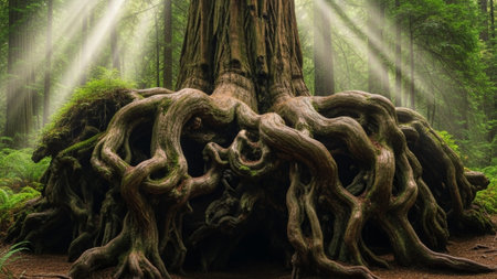 Dramatic low-angle cinematic shot of the massive, gnarled root system of an ancient redwood tree, illuminated by soft, filtering volumetric sunlight.