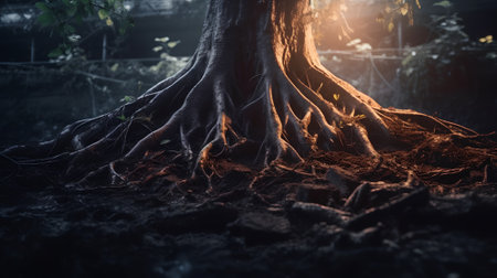 close-up of underground tree roots in light, created with generative ai