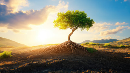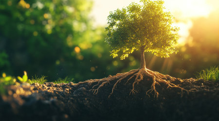 A tree with deep roots in the soil, symbolizing a strong foundation and the concept of growth on a sunny day background. The concept of nature, environmental protection, life, or World Environment Day. --ar 128:71 --v 6.1 Job ID: 2e99bf29-dd8c-40c5-95de-73d2bf99b3d5