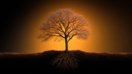 Silhouette of a majestic tree of life with sprawling branches and roots on a glowing background, centered with copy space