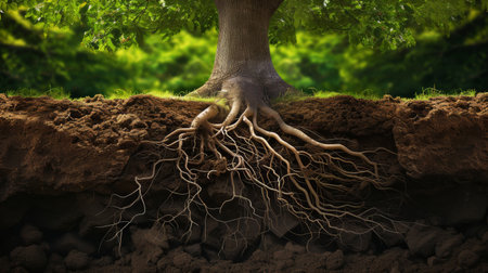 Roots of a tree inside a soil, ground cross section, generative AI illustration