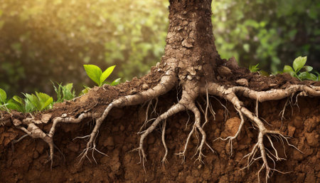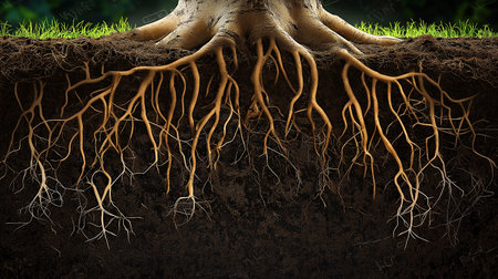 A vibrant illustration showing tree roots weaving through soil in a detailed close-up. This underground view emphasizes the intricate textures and interconnections of roots and soil in