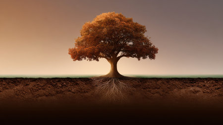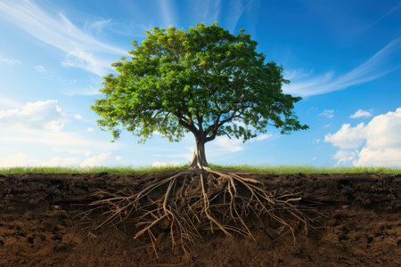 Tree with visible roots underground depicting growth, foundation, strength, and connection to nature, ideal for sustainability and life metaphor concepts.