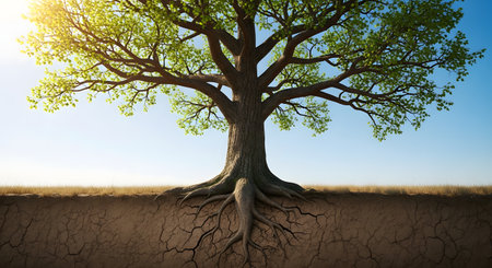 A magnificent, sprawling tree with lush green leaves stands tall against a clear blue sky, with its strong, deep roots visible in a cross-section of the dry, cracked earth. This image symbolizes strength, stability, growth, and the connection between life above and below the surface.