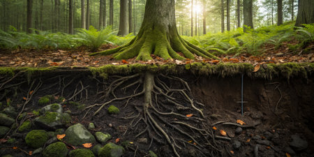 Cross-section of a tree showing intricate root system and surrounding soil
