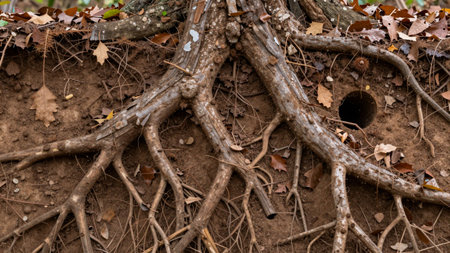 Intricate roots delve into fertile, shadowy earth, revealing nature?s underground network in a peaceful outdoor environment.