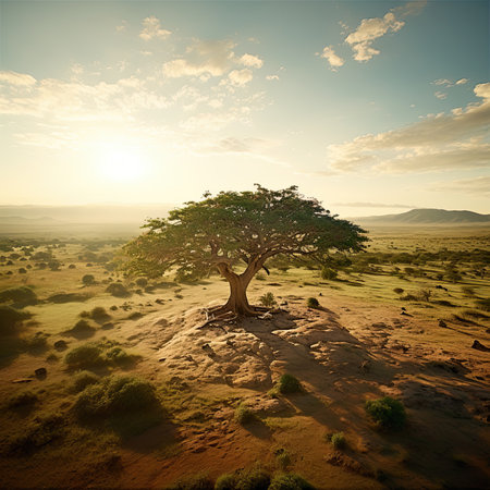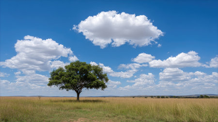 A solitary tree stands majestically in a vast grassland, radiating tranquility. This minimalist scene emphasizes natural beauty and creates a peaceful atmosphere ideal for various themes.