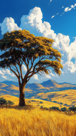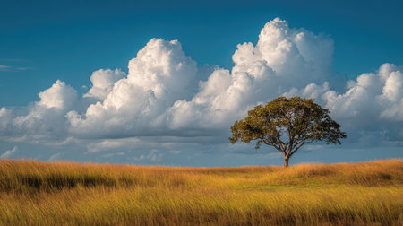A solitary tree rises from a golden sea of grass illuminated by bright sunlight. Fluffy clouds drift lazily across a deep blue sky enhancing the serene atmosphere of this enchanting landscape.