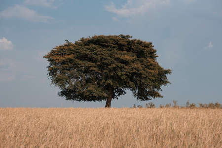 African acacia tree in Serengeti National Park in Tanzania, East Africa, dry season. Africa safari scene in savannah landscape. Tree alone in african scene. Copy space. Wallpaper background. Blue sky.