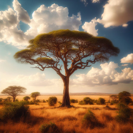 Stunning view of golden grasslands featuring scattered trees under a vibrant sky with fluffy clouds, embodying the serene beauty of the African savannah landscape.