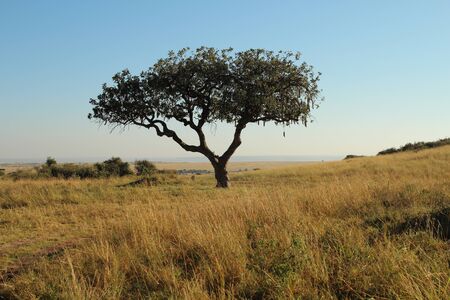 Africa. A lonely tree against a blue sky. Safari in Africa. African steppes with a lonely tree. Kenya. Travel to Kenya.